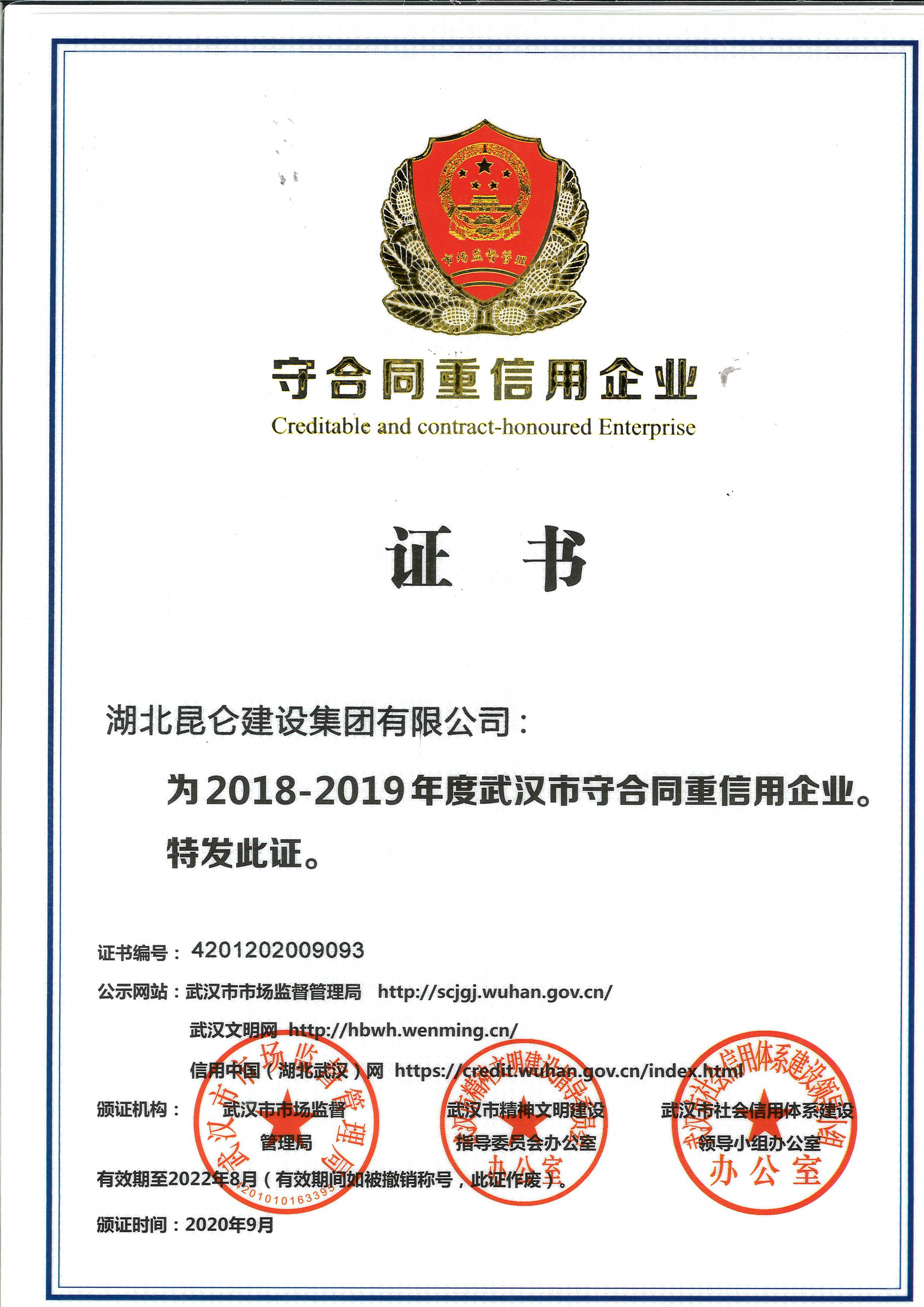 2018~2019年武漢市守合同重信用企業